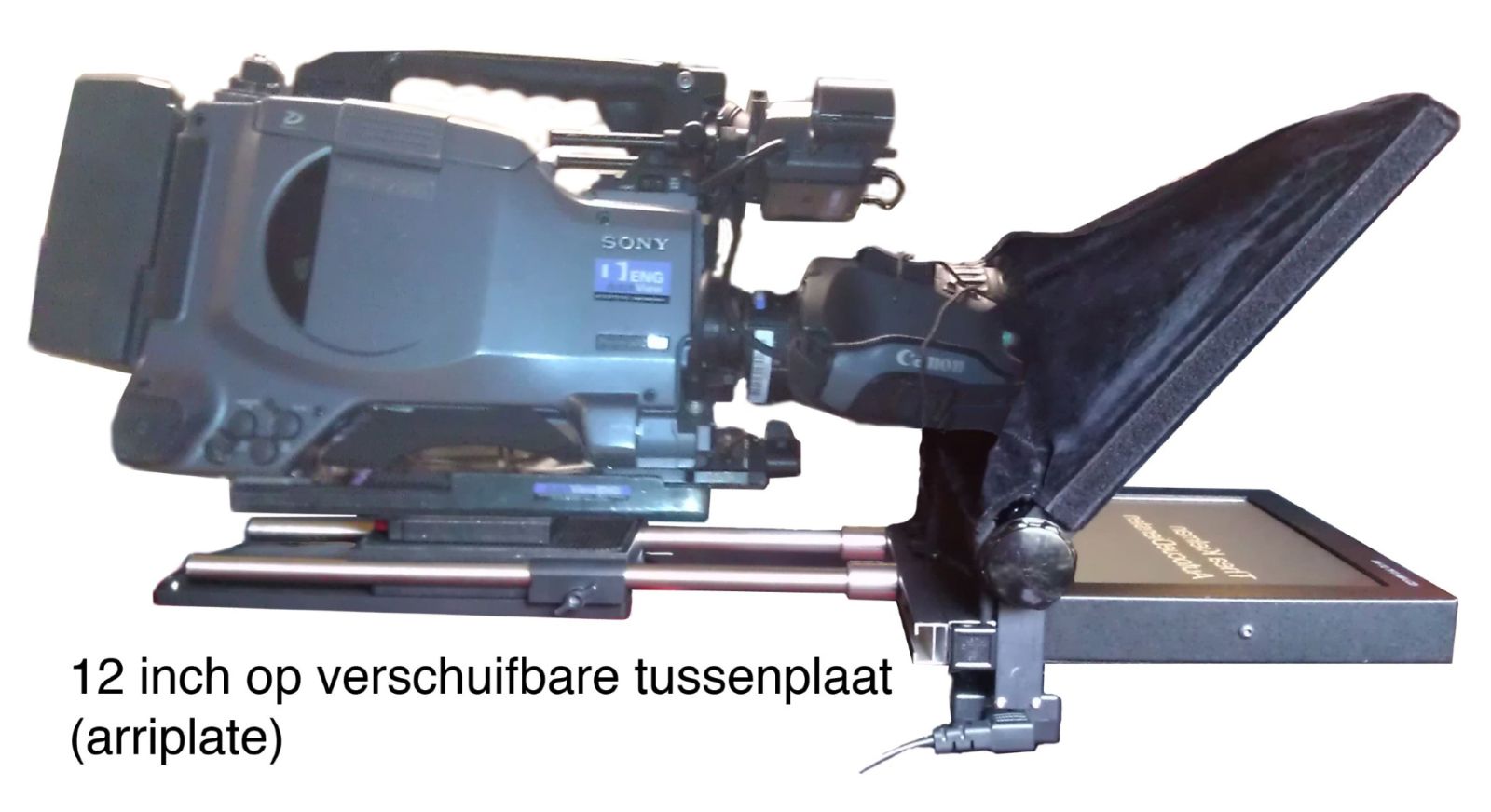 Twee sets on-camera unit met 12 inch monitor, voor grotere lees-afstand. Op tussenplaat. Hoogte verstelbaar dus aan te passen voor de camera.